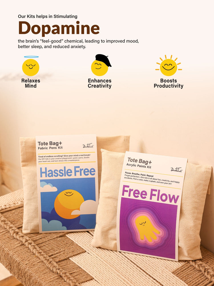 Hassle Free is a DIY pen coloring kit that includes all the essentials to create your own Tote bag easy to use and carry everywhere. It's beginner-friendly and designed to help you unwind while making something meaningful.